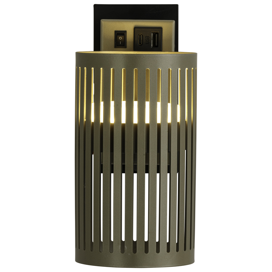8"H Champagne Integrated LED Wall Lamp, 3 watt LED, 300 lumen, 3100K, 90CRI, dual USB A + C port, 8' Silver 45° cord exiting out back of lamp, with perforated metal shade