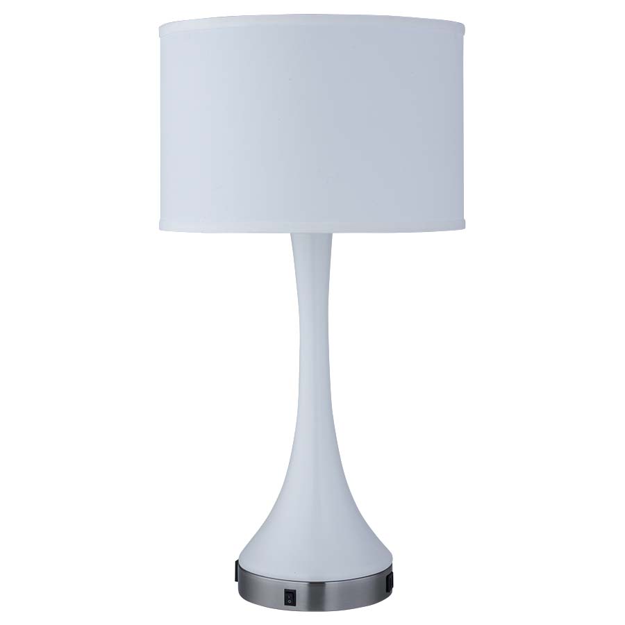 29"H Gloss Signal White and Brushed Nickel Table Lamp, medium base socket, on/off rocker base switch, one outlet, dual USB port, 8' Black 45° 3-prong grounded cord, 15"x15"x10" White Linen Hardback Shade, with 8" Harp and Finial, recommend 1100 lumen LED bulb.