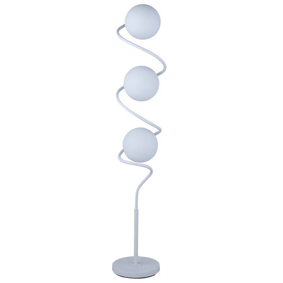 60"H Gloss Signal White Floor Lamp, three GU24 sockets, 12' Silver 45° cord with foot switch, three White Frosted Acrylic Globe Shades, recommend three 1100 lumen LED bulbs with GU24 base.
