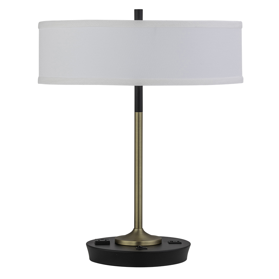 18.75"H Brushed Brass and Matte Black Table Lamp, "S" medium base socket, on/off rocker base switch, one outlet, one USB and One USB-C port, 8' Silver 45° 3-prong grounded cord, 15"x15"x4.5" White Linen Hardback Shade with top and bottom acrylic diffusers, recommend two 800 lumen LED bulbs.
