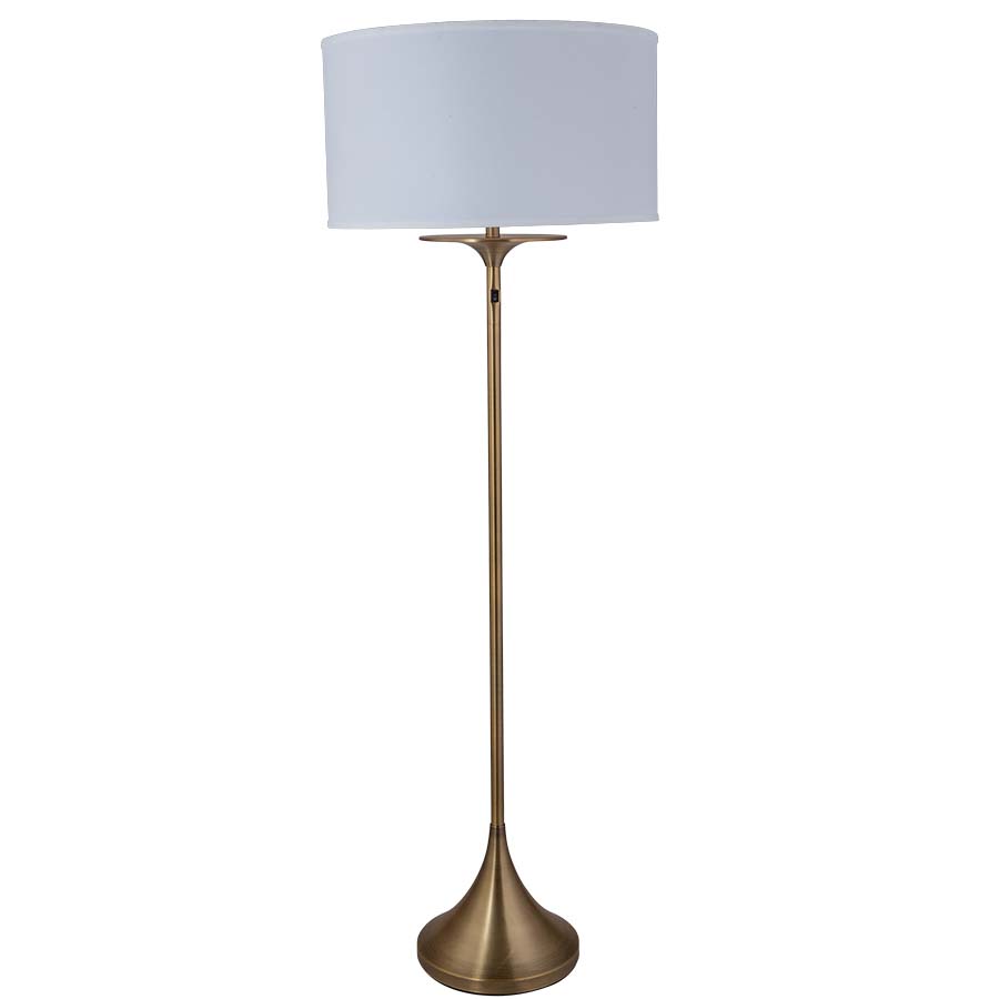 65"H Brushed Brass Floor Lamp, two medium base sockets, on/off rocker switch on column at 48"AFF, 8' Silver 45° cord, 22"x22"x12" Cream Linen Hardback Shade, extra clear lacquer coating over metal parts, recommend two 1600 lumen LED bulbs.