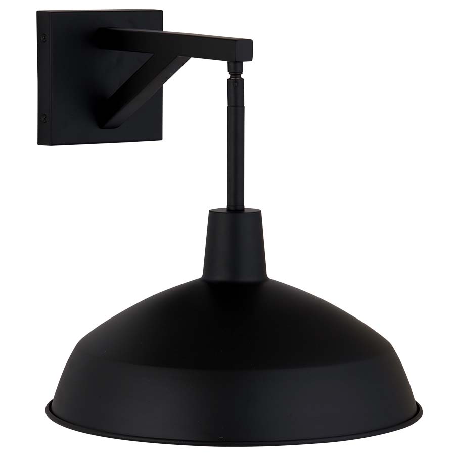 14"H Matte Black Wall Lamp, medium base socket, NO Switch, 8' Silver 45° cord exiting out back of lamp, Matte Black Metal Shade, recommend 800 lumen LED bulb