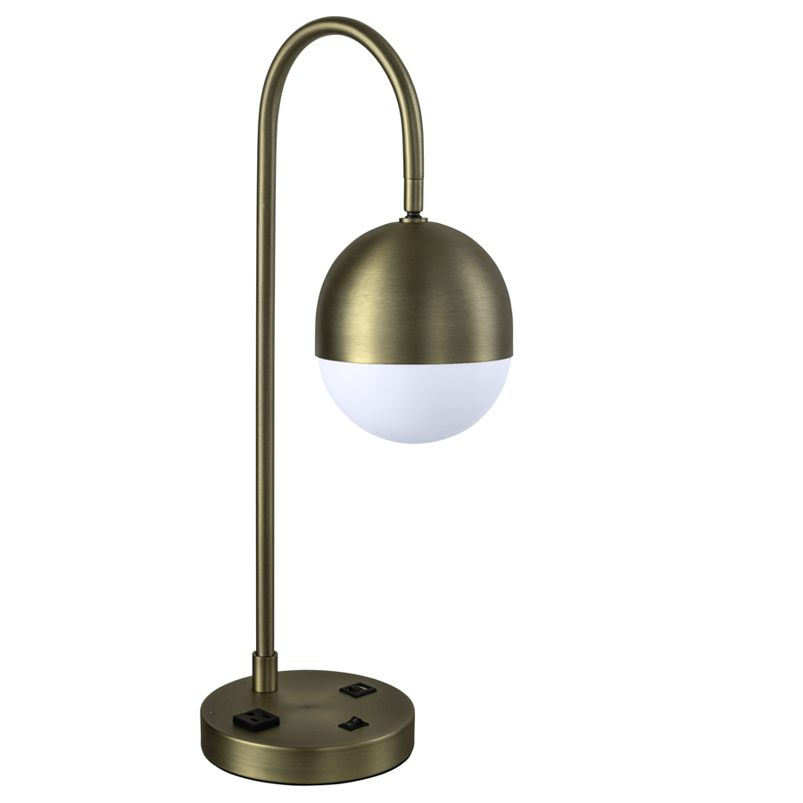 24"H Plated Brushed Brass Table Lamp, medium base socket, on/off rocker base switch, one outlet, dual USB port, 8' Silver 45° 3-prong grounded cord, White Frosted Acrylic Globe, recommend 800 lumen LED bulb