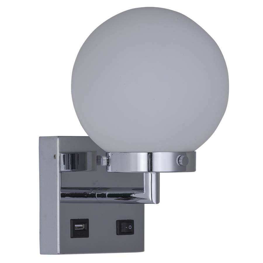 9-3/8"H Polished Chrome Wall Lamp, medium base socket, on/off rocker switch at backplate, one USB port, 8' Silver 45° cord exiting out back of lamp, with Glossy Frosted White Glass Globe, recommend 5 watt LED bulb