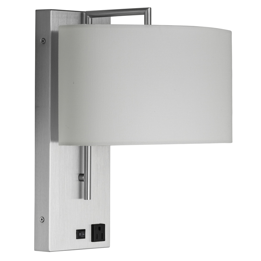 15"H Brushed Nickel Wall Lamp, dual socket, on/off rocker switch at backplate, one outlet, 8' Silver 45° 3-prong grounded cord exiting out the back, 7x15x7x15x7 Oval Cream Linen HB Shade w/Rolled Edges. Recommend two 1100 lumen LED bulbs.