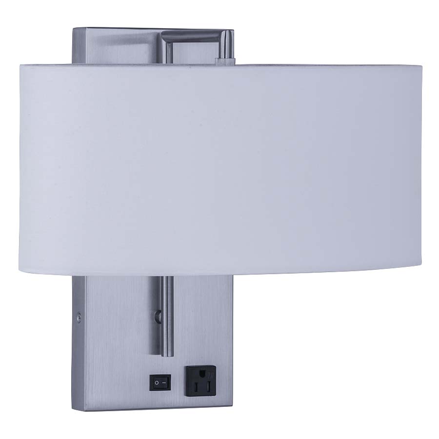 13.75"H Brushed Nickel Wall Lamp, dual socket, on/off rocker switch at backplate, one outlet, 8' Silver 45° 3-prong grounded cord, 17" Brushed Nickel Cordcover, with 7x15x7x15x7 Oval Cream Linen HB Shade w/Rolled Edges. Recommend two 1100 lumen LED bulbs.