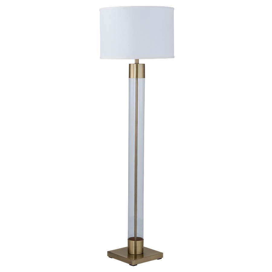 62"H Satin Brushed Brass with Clear Cylinder Acrylic Floor Lamp, medium base socket with push thru socket switch, 8' Silver 45° cord, 18"x18"x12" Natural Linen Hardback Shade, recommend 1600 lumen LED bulb