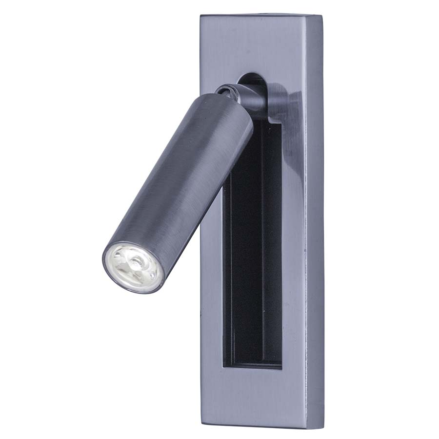 6"H Brushed Chrome Integrated LED Reading Light, 2.64 watt LED, 230 lumen, 2700K, 90CRI, switches off when arm is closed, turns on when arm is opened, 8' Silver 45° cord exiting out back of lamp
