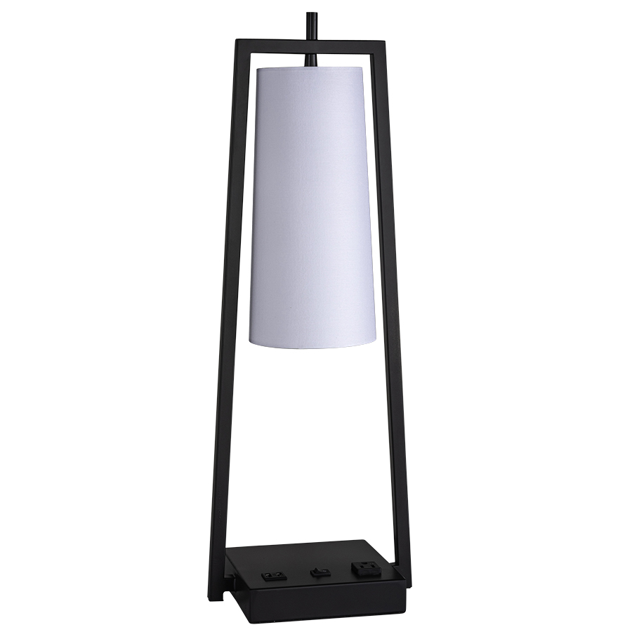 26"H Espresso Table Lamp, medium base socket, on/off rocker base switch, one outlet, dual USB port, 5' Silver 45° 3-prong grounded cord, 4-5/8"x5-3/4"x12" Tapered Cylinder White Linen Hardback Shade with Rolled Edges, recommend 800 lumen LED bulb