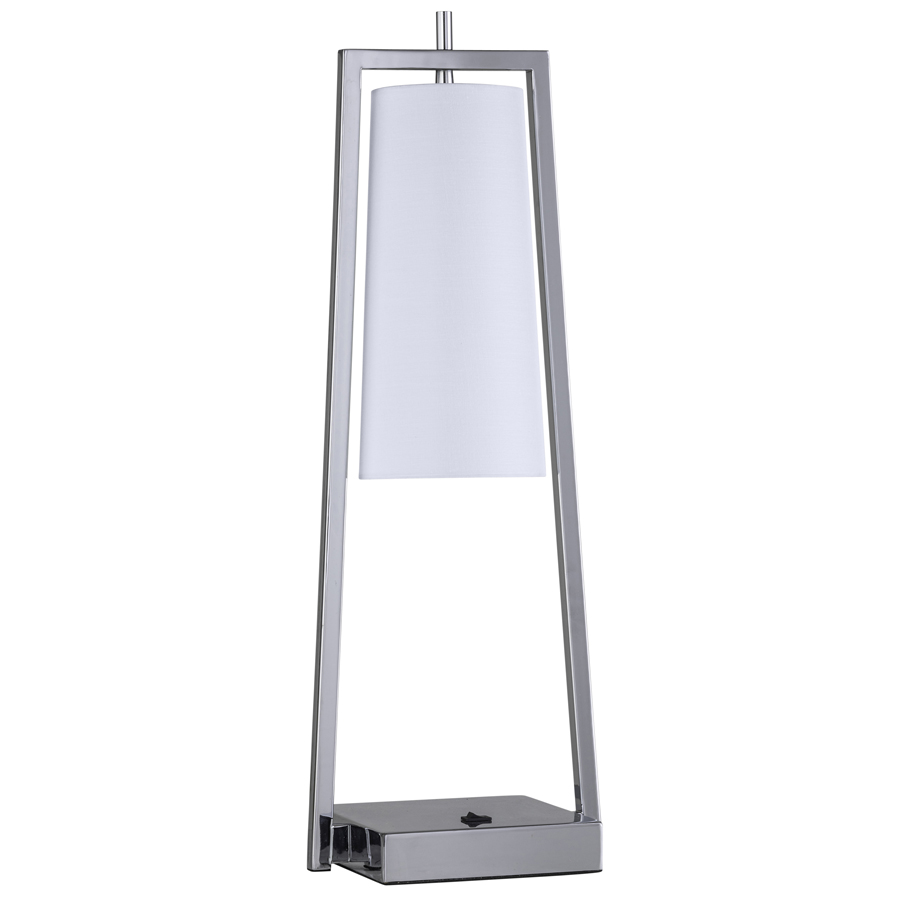 26"H Polished Chrome Table Lamp, medium base socket, on/off rocker base switch, 5' Silver 45° cord, 4-5/8"x5-3/4"x12" Tapered Cylinder White Linen Hardback Shade with Rolled Edges, recommend 800 lumen LED bulb