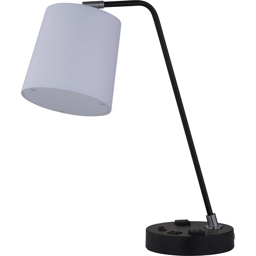20"H Blackened Iron PC and Brushed Nickel Table Lamp, E26 socket, rocker switch, 8' Silver 45° 3-prong grounded cord, two outlets, dual USB port, 6x7x7" White Linen Canvas Shade with Rolled edges, top/bottom diffusers, recommend 1100 lumen LED bulb