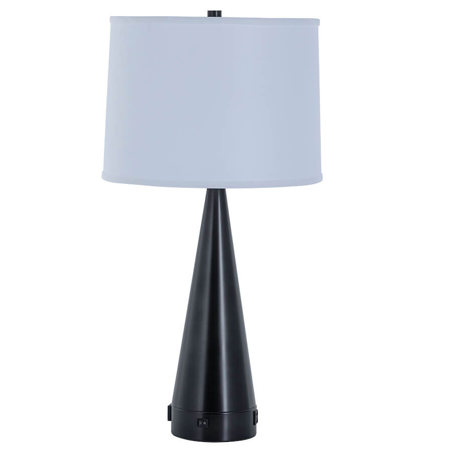 29"H Brushed Black Aluminum Table Lamp, medium base socket, on/off rocker base switch, one outlet, dual USB port, 8' Silver 45° 3-prong grounded cord, 14"x15"x11" White Linen Hardback Shade, 10" Harp & Finial, recommend 1100 lumen LED bulb