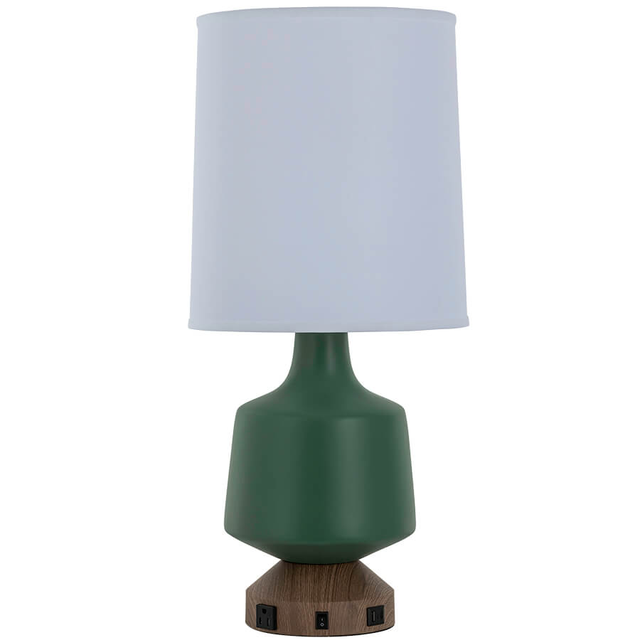 28"H Kendal Green SW6467 Resin and Bleached Legno Table Lamp, medium base socket, on/off rocker base switch, one outlet, one USB and one USB-C port, one 12 amp Circuit Breaker, 10' Black 45° 3-prong grounded cord, 12"x13"x14.5" White Linen Hardback Shade, 12" Harp & Finial, recommend 1100 lumen LED bulb