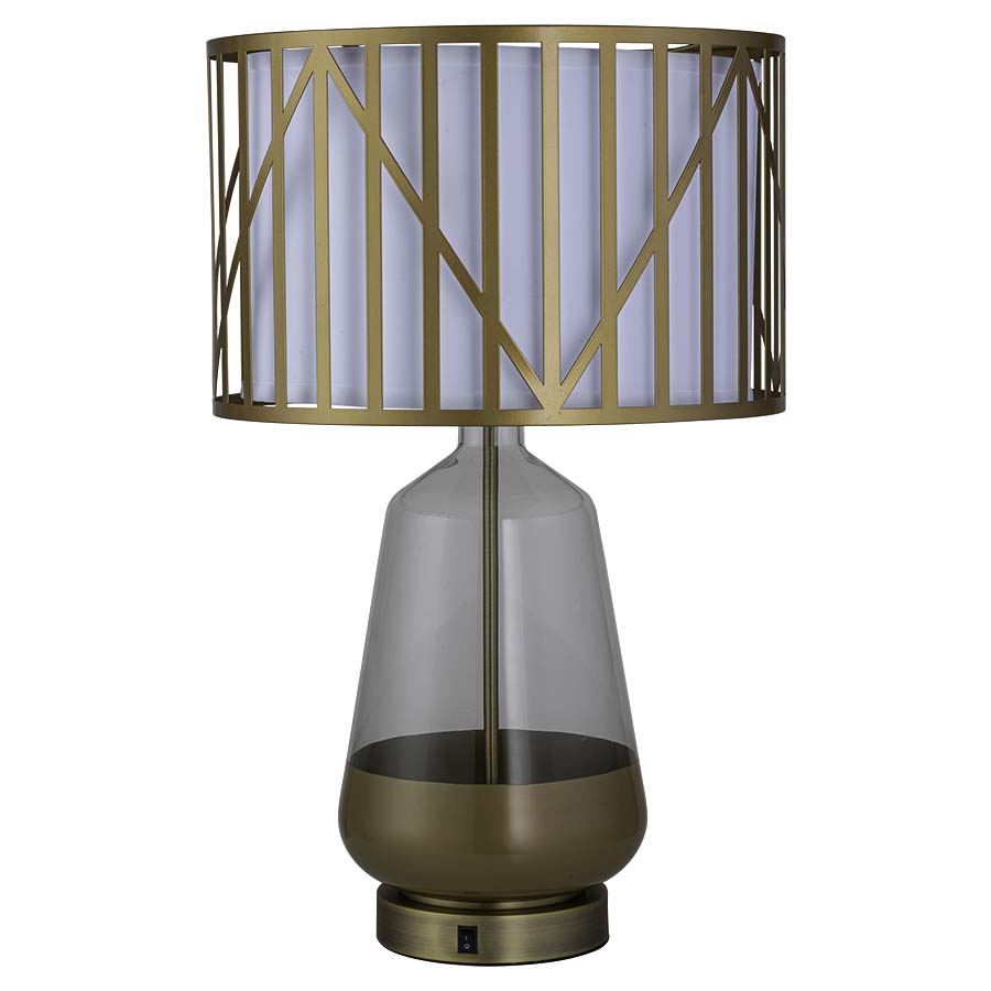 27"H Brushed Brass and Clear Glass Table Lamp, medium base socket, on/off rocker base switch, 8' Silver 45° cord, 17"x17"x11" Brushed Brass Metal Outer Shade with 15"x15"x10" White Linen Hardback Inner Shade, recommend 1100 lumen LED bulb