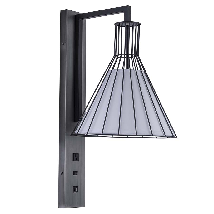 29" Pewter Brushed Nickel and Matte Black Wall Lamp, medium base socket, on/off rocker switch at backplate, one outlet, dual USB port, 6' Silver 45° 3-prong grounded cord exiting out back of lamp, Matte Black Wire Frame Outer Shade with White Linen Hardback Inner Shade, recommend 1100 lumen LED bulb