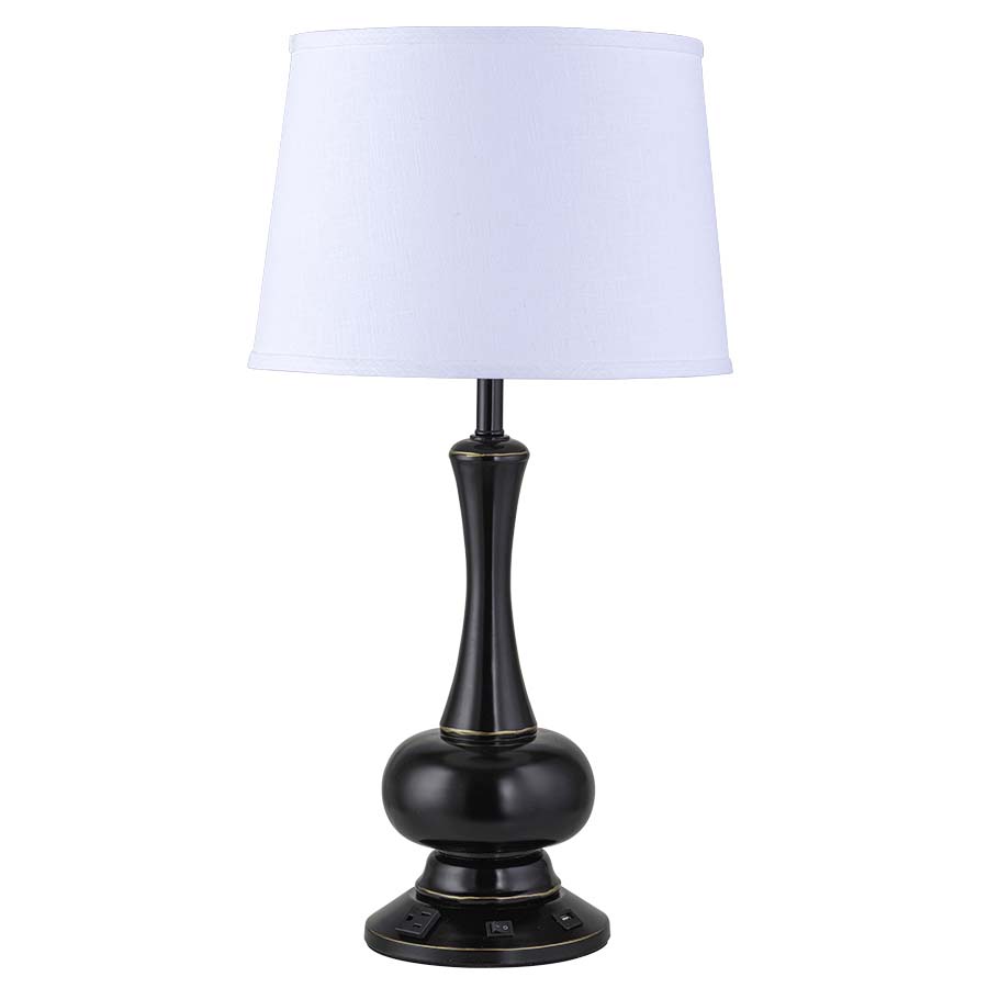 29" Black with Gold highlights Table Lamp, "S" arm medium base socket, on/off rocker base switch, one outlet, one USB port, 9' Silver 45° 3-prong grounded cord, 13"x15"x10.5" Milano Cream HB Shade, recommend two 1100 lumen LED bulbs