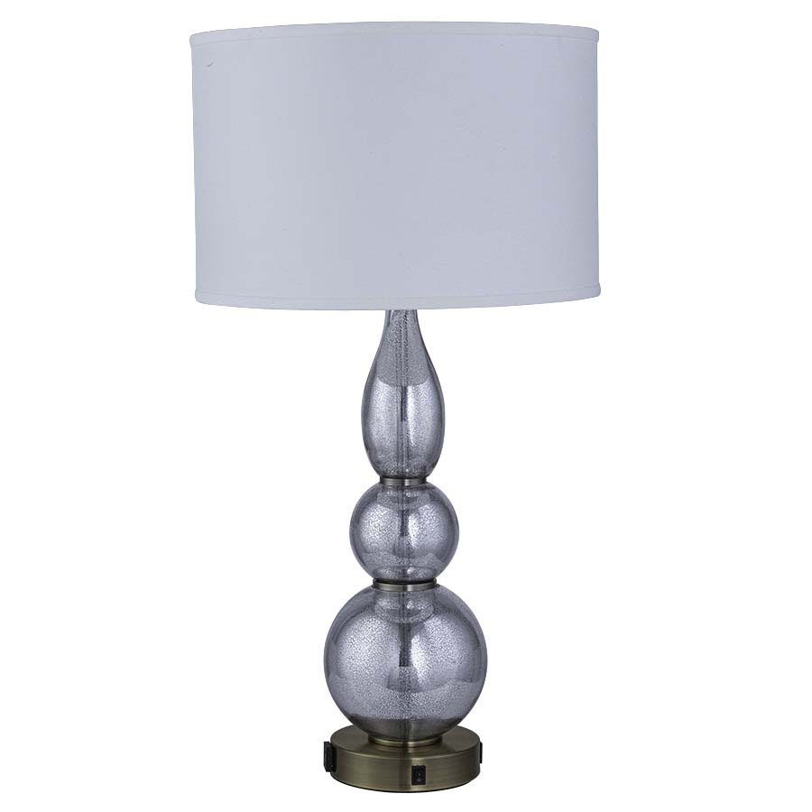 32" Antique Mercury Glass and Antique Brass Table Lamp, "S" arm medium base socket, on/off rocker base switch, one outlet, one USB port, 9' Silver 45° 3-prong grounded cord, with extra clear lacquer coating over all metal parts, 17"x17"x11" Cream Linen HB Shade, recommend two 1100 lumen LED bulbs