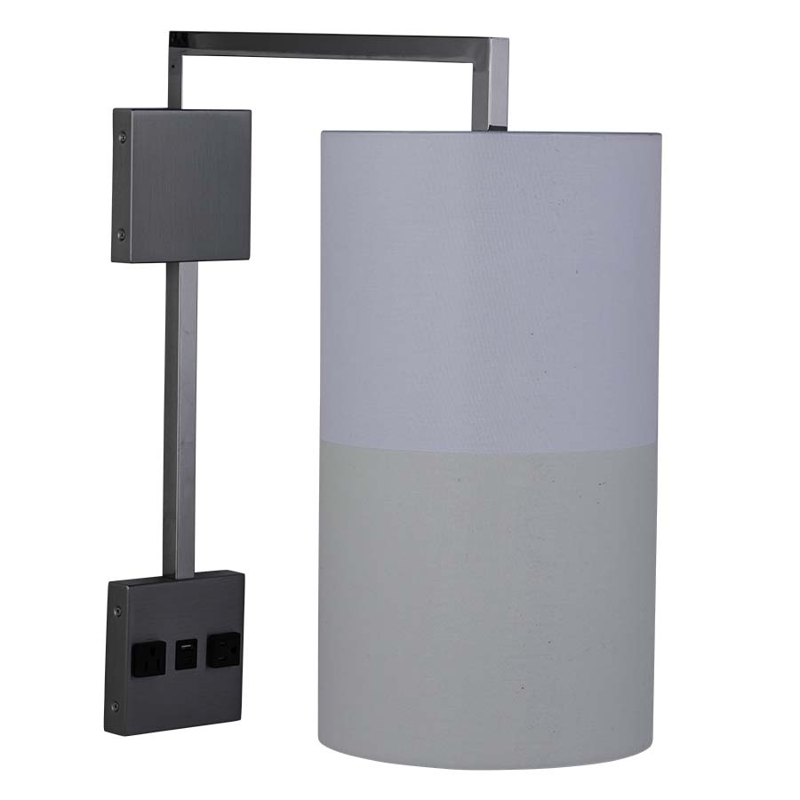 23"H Brushed Nickel and Polished Nickel Wall Lamp, GU24 socket, NO Switch, two outlets, one USB port and one USB-C port, direct wired, 10"x10"x18" Two-Tone White and Parchment Linen Hardback Shade with Rolled Edges, recommend 1100 lumen LED bulb with GU24 base