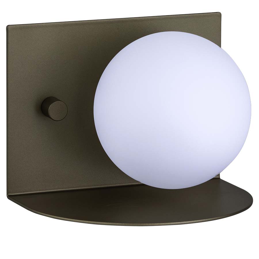 6"H Modern Gold Table Lamp, G9 socket, dimmable dial switch on base, 8' Black 45° cord exiting out bottom of lamp thru Bolt Down, 4.75" diameter White Frosted Glass Globe, recommend 4 watt JCD LED G9 bulb