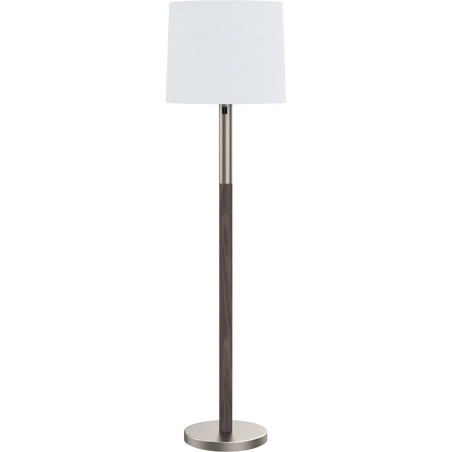 63.5"H Brushed Nickel and Walnut Floor Lamp, two E26 sockets, rocker switch on column at 48"AFF, 8' Silver 45° cord, 16"x17"x14" White Linen Hardback Shade with Rolled Edges and top and bottom acrylic diffusers, recommend two 1100 lumen LED bulbs