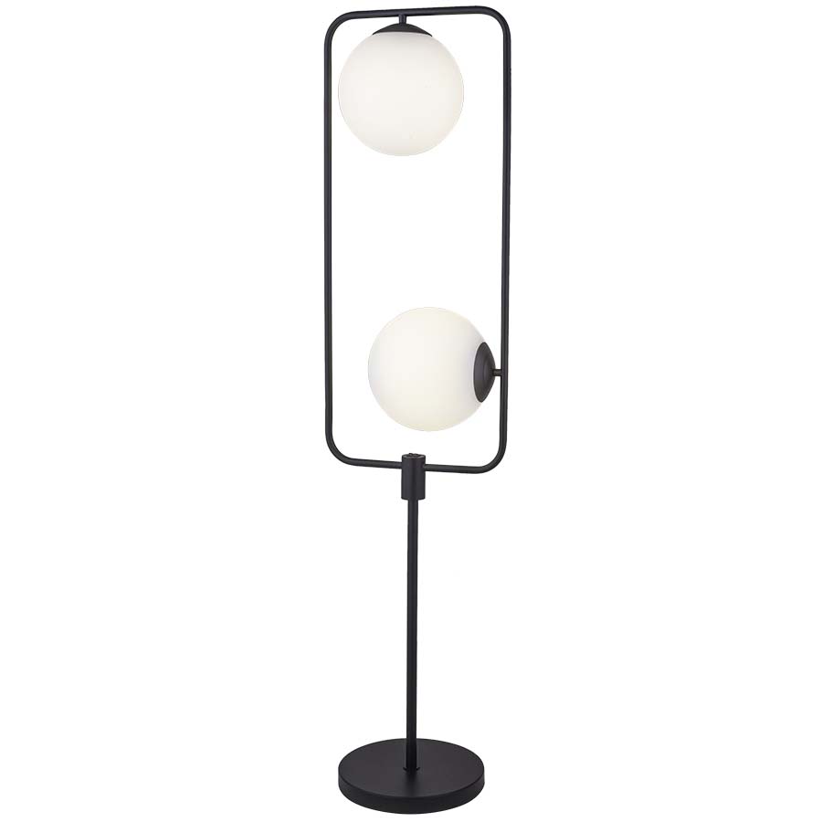 62"H Matte Black Floor Lamp, two medium base sockets, dual on/off switch at top of column, 8' Silver 45° cord, with two White Frosted Glass Globes, recommend two 800 lumen LED bulbs