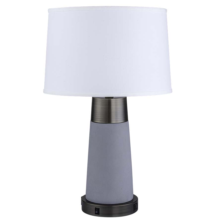 24.75"H Faux Concrete and Aged Antique Brass Table Lamp, medium base socket, on/off rocker base switch, one outlet, dual USB port, 8' Black 45° 3-prong grounded cord, with extra clear lacquer coating over all metal parts, 14"x15.5"x10" White Linen Hardback Shade, 8" Harp & Finial, recommend 1100 lumen LED bulb