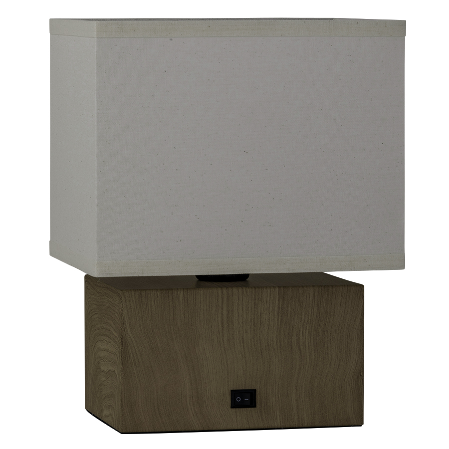 13"H New Age Oak Table Lamp with Matte Black accent, medium base socket, on/off rocker base switch, 6' Black Fabric 45° cord, 8"x10"x8"x10"x8" Rectangle Natural Linen Hardback Shade, recommend 800 lumen LED bulb
