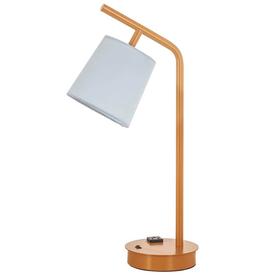 21"H Broom Yellow Powder Coat Table Lamp, Medium Based Socket, On-Off Rocker Switch, One Convenience Outlet, 12' Black 45° 3-prong Cord, with bolt down, Includes a 4.5 x 5.5 x 5.5 White Linen Hardback Shade.