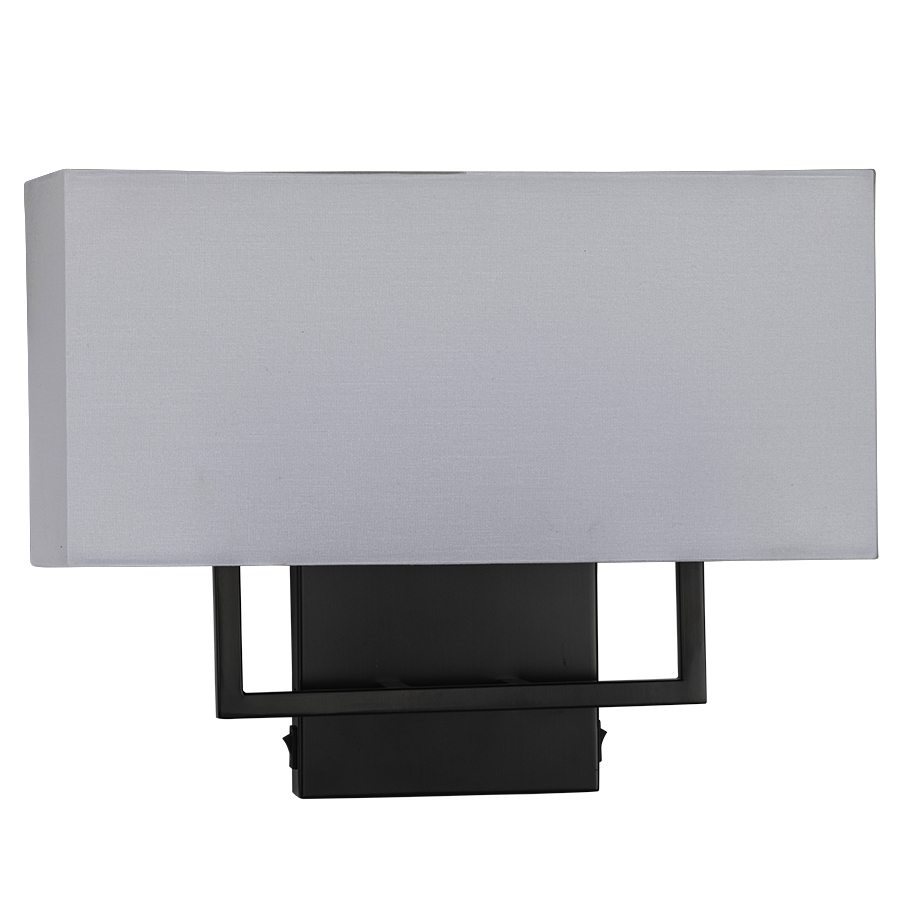 12"H Plated Dark Bronze Wall Lamp, Two Medium Based Sockets, Two On-Off Rocker Switches, 8™ Silver 45° Cord that exits the back of the Fixture. Includes a 16 x 4 x 7.5 White Linen Hardback Half Shade. Recommend two 1100 lumen LED bulbs