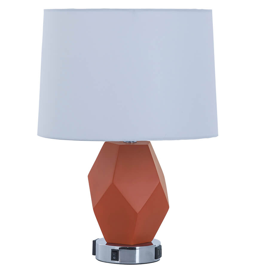 18"H Rotorange to match RAL2001 and Polished Chrome Table Lamp, medium base socket, on/off rocker base switch, one Outlet, One USB and One USB-C port, 8' Silver 45° 3-prong grounded cord, 12"x13"x9" White Linen Hardback Shade with Rolled Edges, 7.5" Harp & Finial, recommend 800 lumen LED bulb