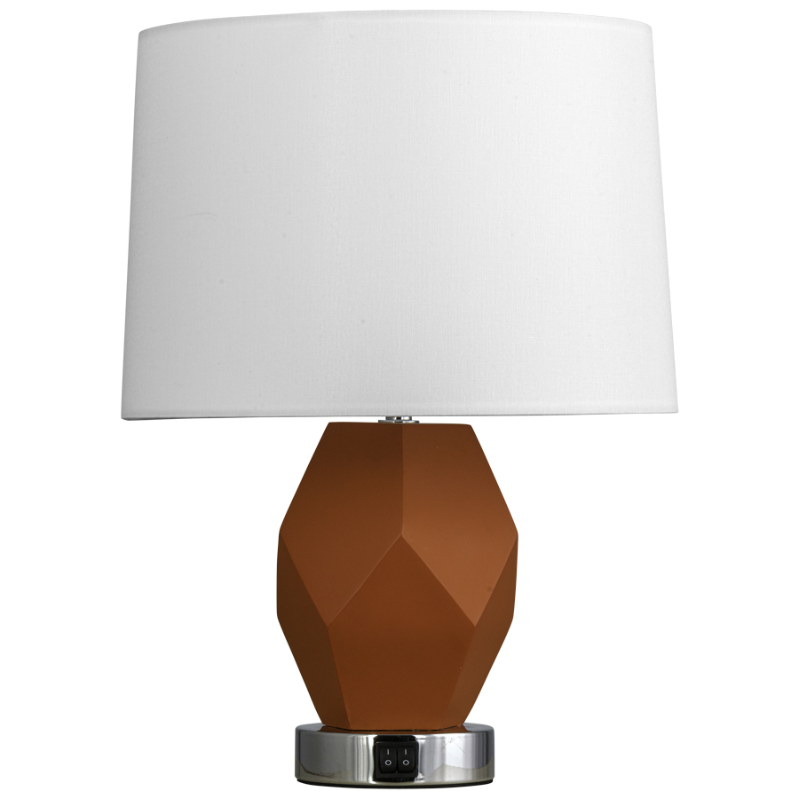 18"H RAL2001 Rotorange and Polished Chrome Table Lamp, dual medium base socket, dual on/off rocker base switch, 8' Silver 45° cord, includes 12"x13"x9" White Linen Hardback Shade with Rolled Edges, recommend two 800 lumen LED bulbs