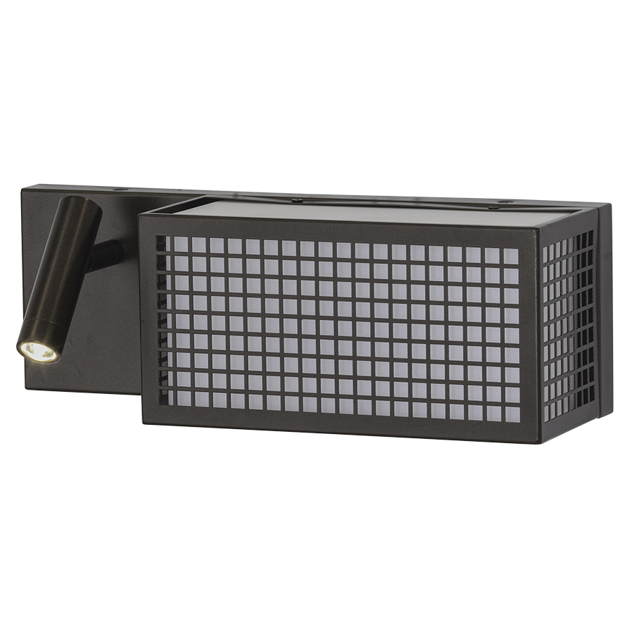 15"W Painted Olde Bronze Wall Lamp, one medium base socket & one 3 watt Integrated LED, 8' Silver 45° cord exiting out back of lamp, two on/off rocker switches on left side, with a perforated metal grid and a white frosted acrylic diffuser. Recommend 1100 lumen LED bulb.