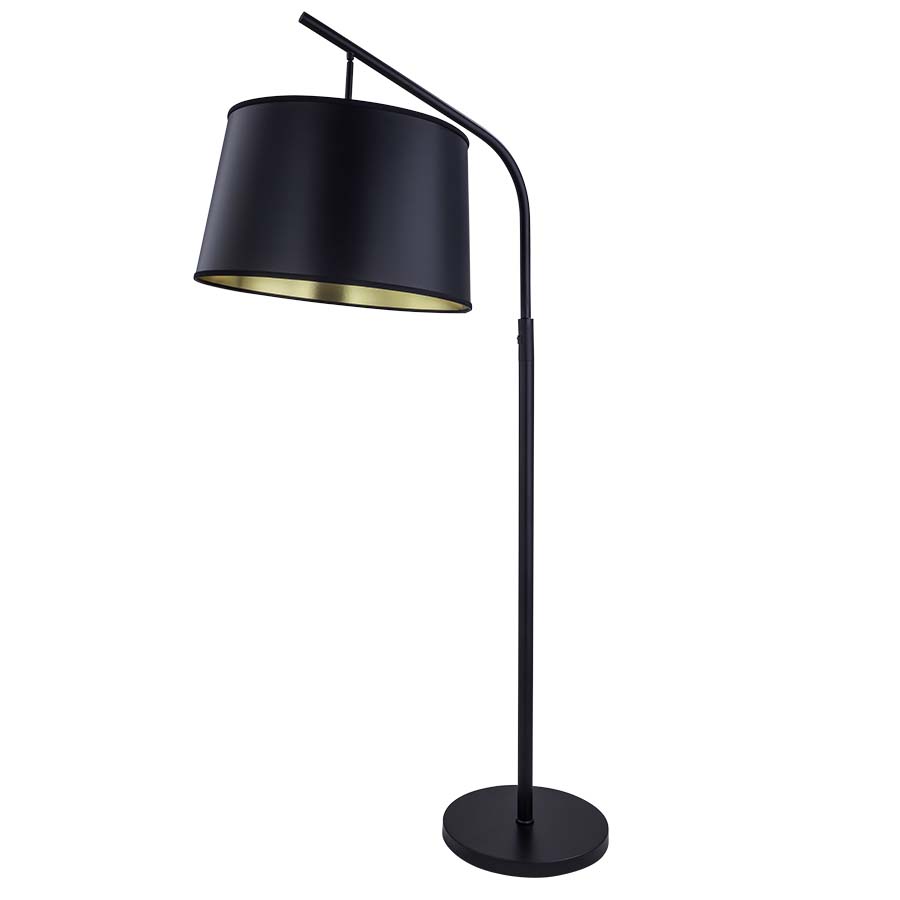 75"H Matte Black Floor Lamp, medium base socket, on/off rocker switch on column at 48"AFF, 12' Silver 45° cord, 20"x23"x14" Black Leatherlite with Gold Interior HB Shade, recommend 1100 lumen LED bulb