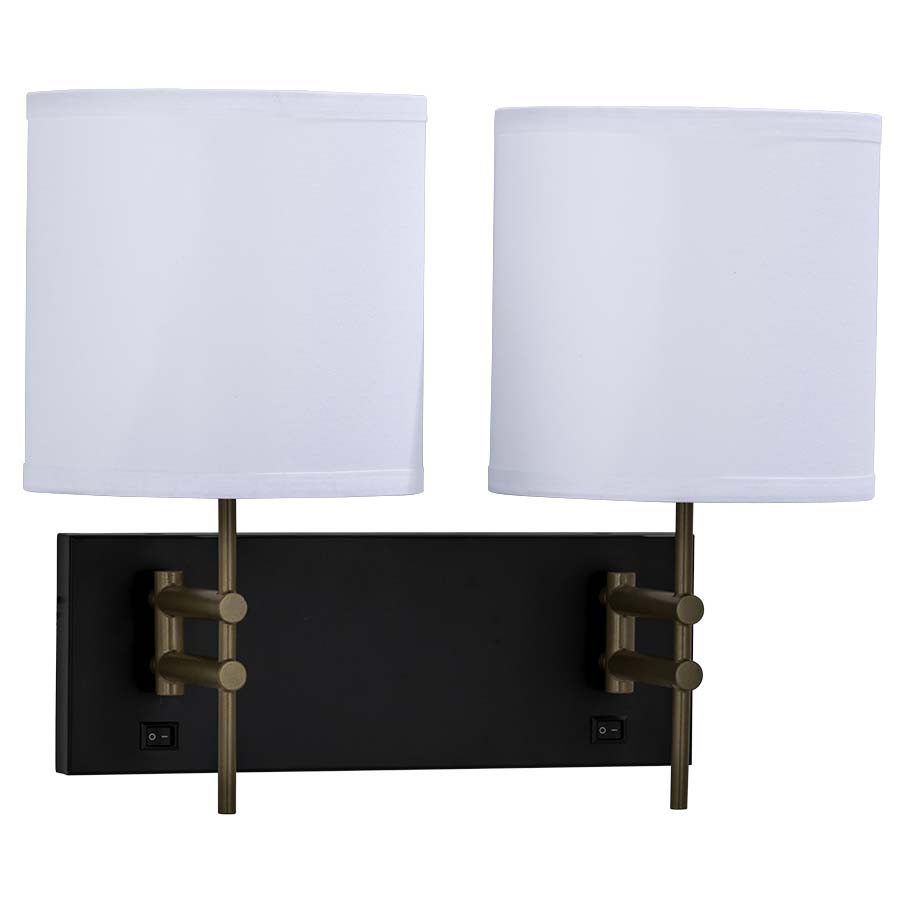 14.5"H Powder Coated Matte Black and Sungold, 2-GU24 skts, two independent on/off rkr switches, direct wired, Two 8 x 8 x 8 Round White Linen HB Shades. Recommend 2-1100 lumen LED bulbs with GU24 base