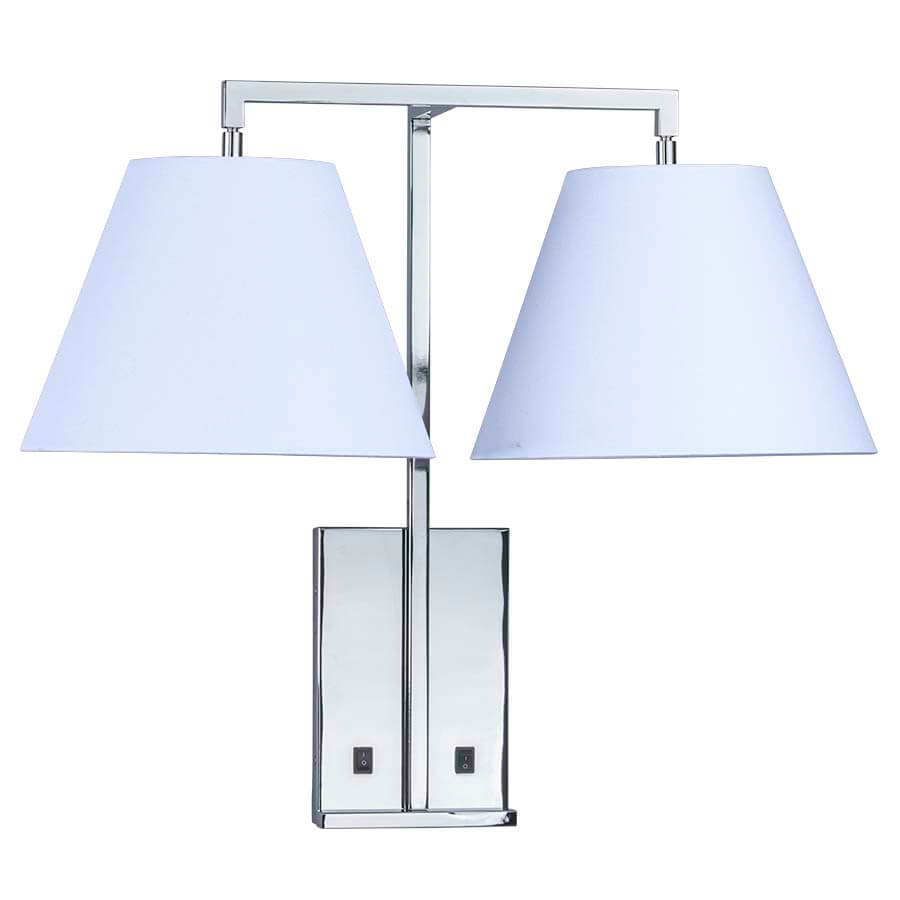 22"H Plated Polished Chrome Wall Lamp, two medium base sockets, two on/off rocker switches at backplate, 8' Silver 45° cord exiting out back of lamp, two 6"x12"x9" White Linen Hardback Shades with Rolled Edges, recommend two 800 lumen LED bulbs