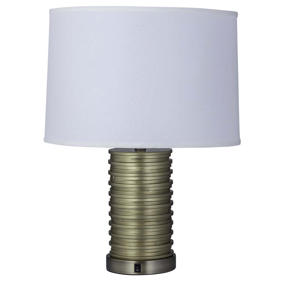 24"H Antique Brass Resin Table Lamp, GU24 socket, on/off rocker base switch, 6' Silver 45° cord, all metal parts have extra clear lacquer coating, 17"x18"x12" Cream Linen Hardback Shade with top acrylic diffuser, recommend 1100 lumen LED bulb