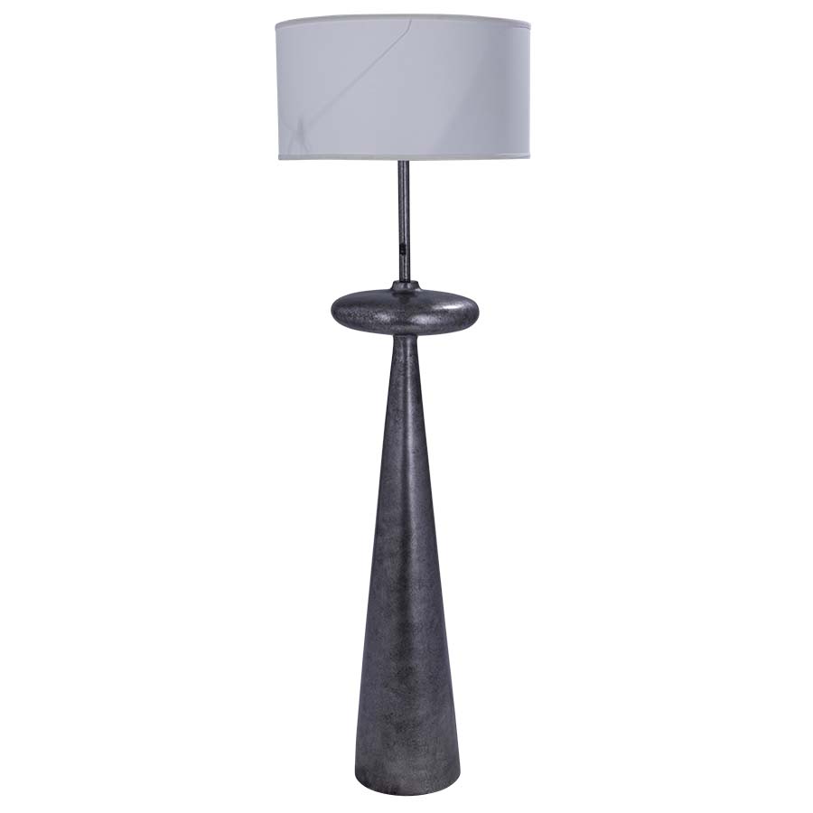 68"H Painted Antique Aluminum Resin Floor Lamp, medium base socket, on/off rocker switch on column @ 48"AFF, 6' Silver 45° cord, all metal parts have extra clear lacquer coating, 22"x22"x12" Cream Linen Hardback Shade, recommend 1100 lumen LED bulb