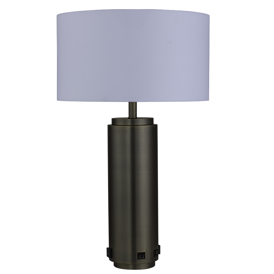 30"H Aged Brass Table Lamp, dual medium base socket, dual on/off rocker base switch, two outlets, dual USB port, 8' Silver 45° 3-prong grounded cord, 18"x18"x10" White Linen Hardback Shade with Rolled Edges, recommend two 1100 lumen LED bulbs.