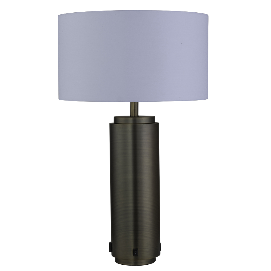 30"H Aged Brass Table Lamp, medium base socket, on/off rocker base switch, one outlet, dual USB port, 10' Silver 45° 3-prong grounded cord, 18"x18"x10" White Linen Hardback Shade with Rolled Edges, recommend 1100 lumen LED bulb