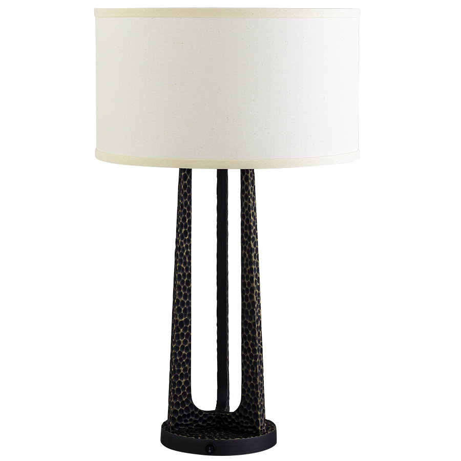 26.25"H Plated Dark Bronze with Hand Hammered Texture Cast Copper Column Table Lamp, medium base socket, round on/off rocker base switch, 8' Black 45° cord, 16"x16"x8.75" Natural Linen Hardback Shade, recommend 800 lumen LED bulb