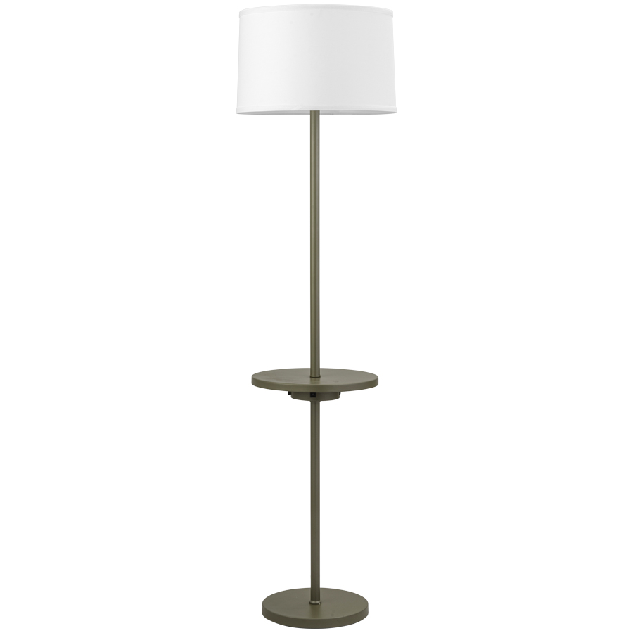 62"H Powder Coat Champagne Floor Lamp, with Tray Table @ 24"H, medium base socket, on/off rocker switch on table, one outlet, dual USB A + C port, 10' Silver 45° 3-prong grounded cord, includdes 15"x16"x10" White Linen Hardback Shade, recommend 1100 lumen LED bulb