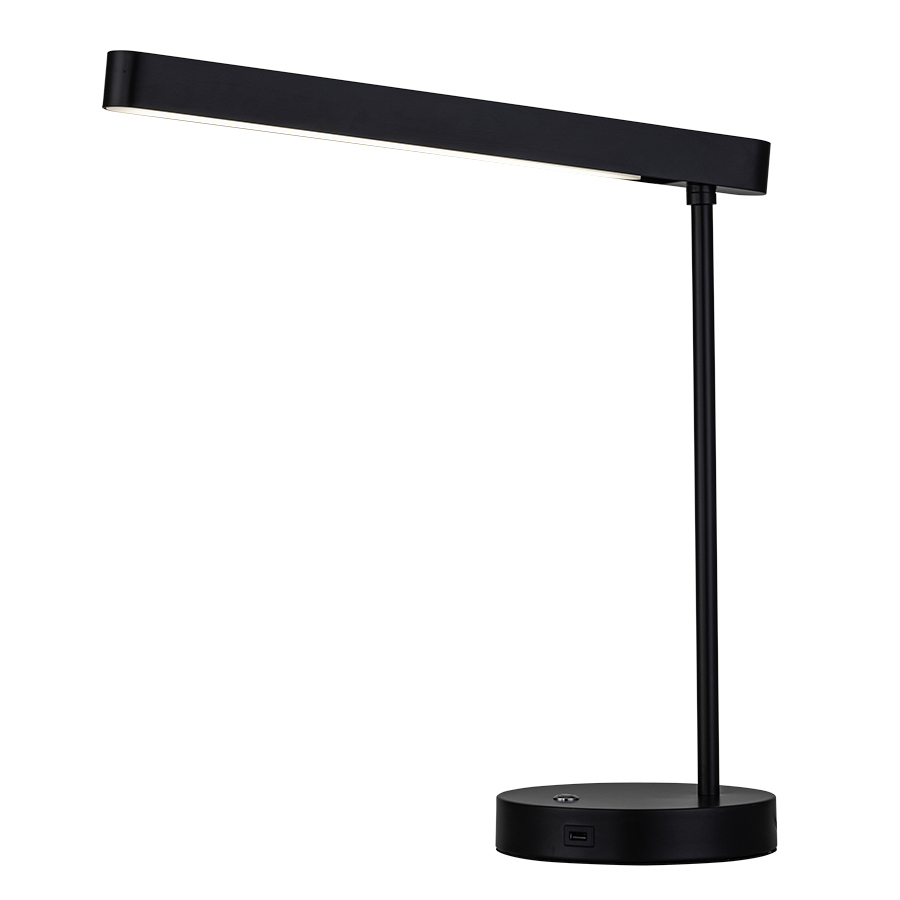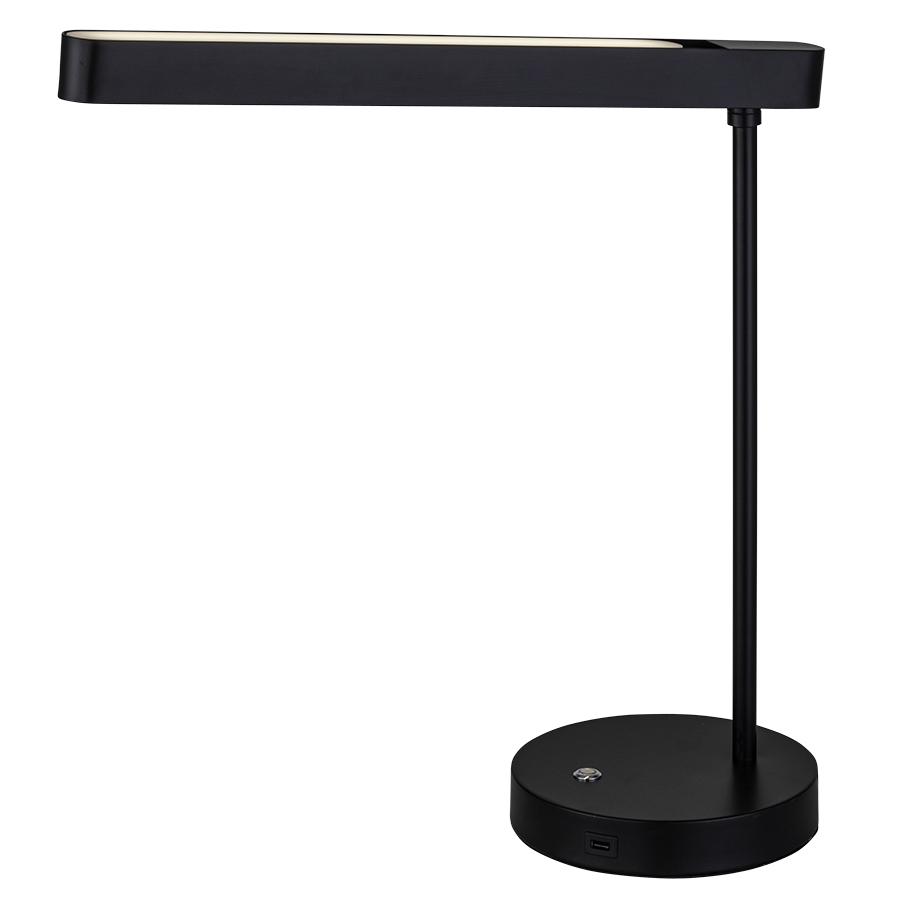 22"H Matte Black Integrated LED Desk Lamp, 12 watt LED, 3000K, 100-120V AC, one on/off touch switch with traffic orange accent, two USB ports, 10' Black 45° cord, Metal Shade with top and bottom acrylic diffusers
