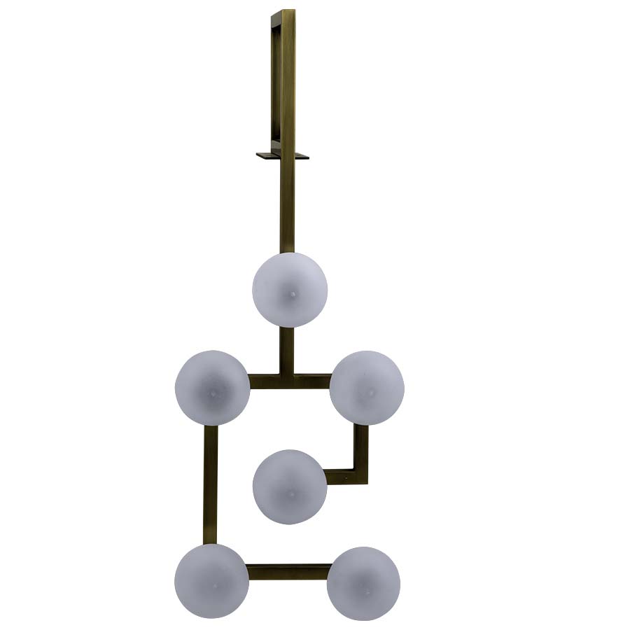 32"H Antique Brass Wall Lamp, Six G9 Sockets, No Switch, 12' Black 45° Cord to Exit the Bottom of Fixture, with Six 4" diameter White Translucent Acrylic Globes, Recommend six 4 watt JCD LED G9 bulbs