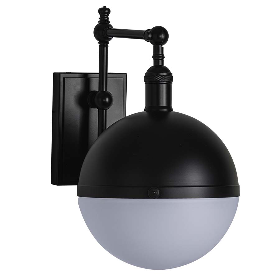 14"H Matte Black Wall Lamp, medium base socket, direct wired, with Frosted White Glass Globe, recommend 800 lumen LED bulb