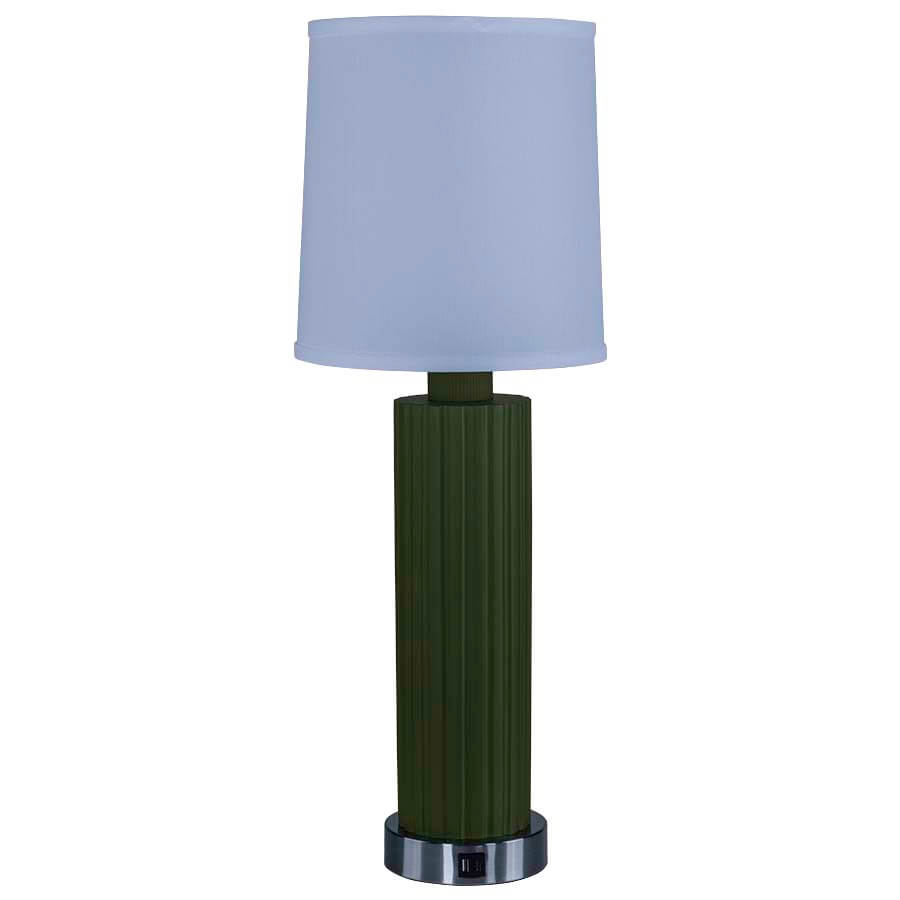 30"H Green Etched to match SW6438 Dill and Brushed Nickel Table Lamp, medium base socket with push thru socket switch, one USB and one USB-C port, 8' Silver 45° 3-prong grounded cord, 10"x11"x12" White Linen Hardback Shade, 10" harp & finial, recommend 1100 lumen LED bulb