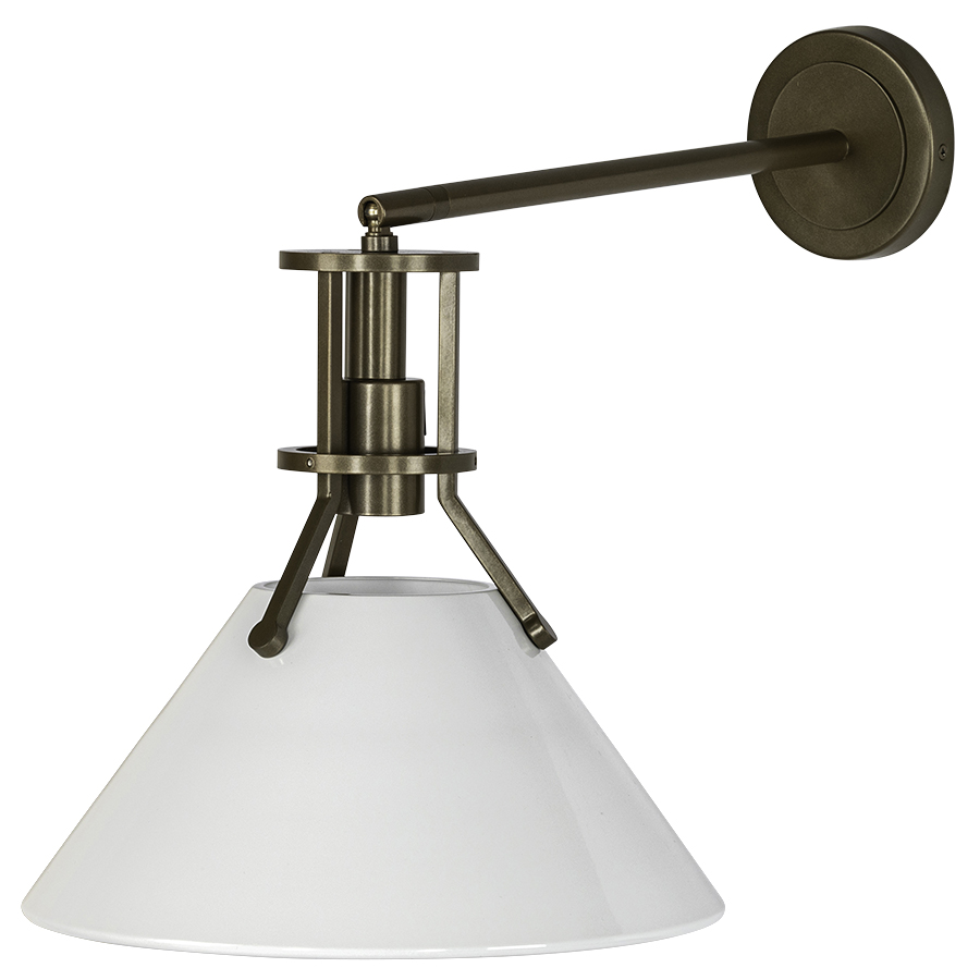14"H Powder Coat Brass Wall Lamp, medium base socket, direct wired, Powder Coated White Metal Shade, recommend 5.5 watt T10 Clear Glass LED bulb