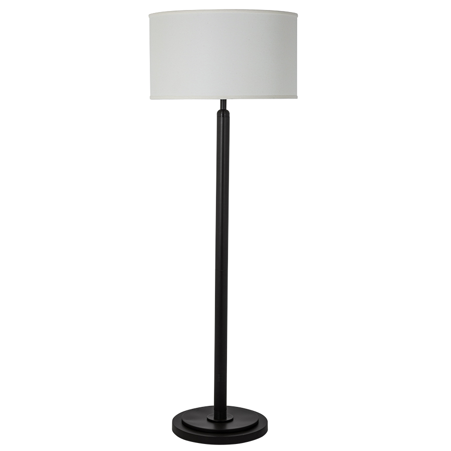 64.5"H Bronze Floor Lamp with decorative threaded portions at top and bottom, dual medium base socket, 8' Silver 45° cord with foot switch, 22"x22"x12.5" Natural Linen Hardback Shade, recommend two 1100 lumen LED bulbs
