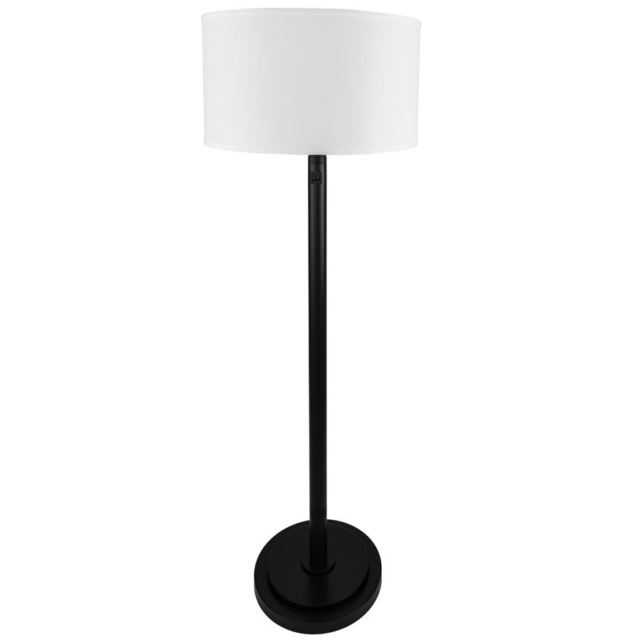 64.5"H Pottery Bronze Floor Lamp with decorative threaded portions at top and bottom, dual medium base socket, dual on/off rocker switch on column @ 48"AFF, 8' Silver 45° cord, 22"x22"x12.5" White Linen Hardback Shade, 11" Harp & Finial, recommend two 1100 lumen LED bulbs