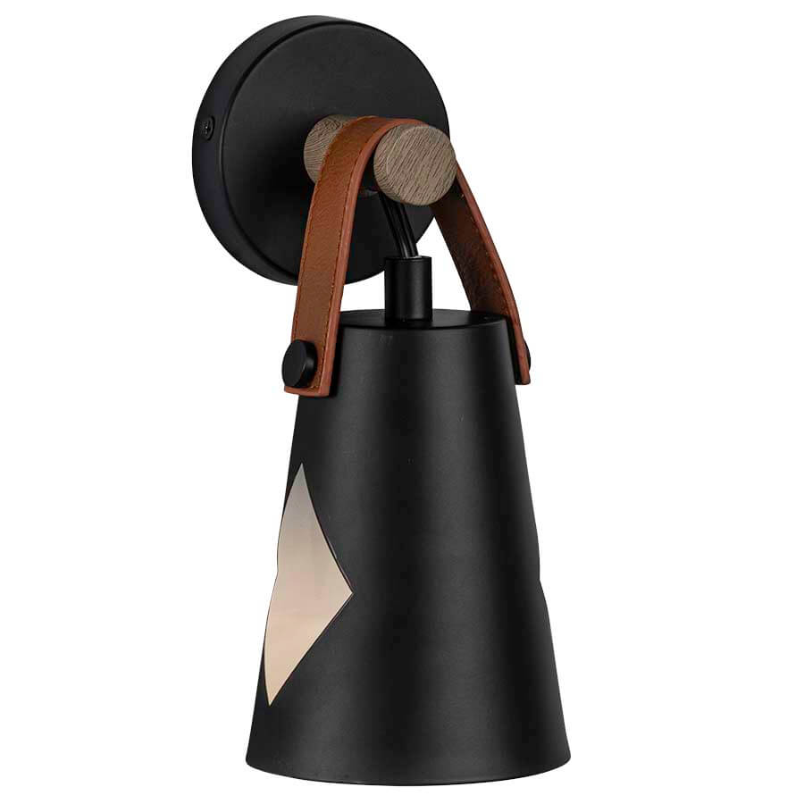 9"H Matte Black Wall Lamp with Natural Wood Down and Brown Leather Strap, medium base socket, direct wired, Matte Black Perforated Metal Shade with diamond shape on sides and front, recommend 5 watt LED bulb