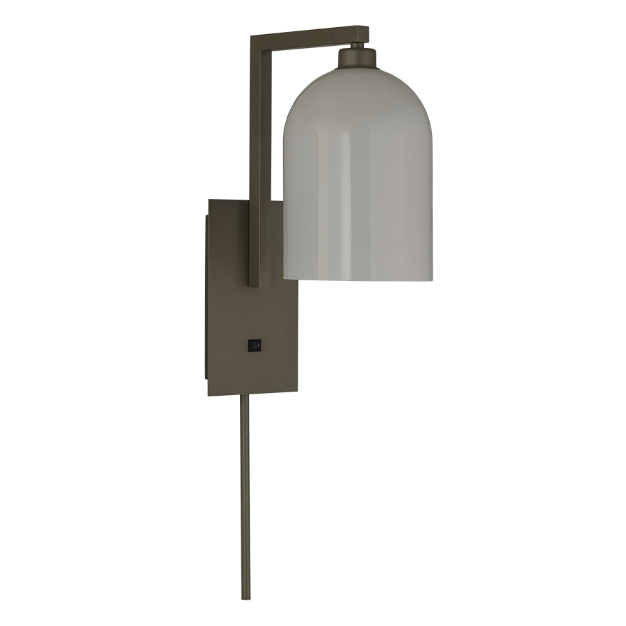 27.5"H Champagne Wall Lamp, medium base socket, on/off rocker switch at backplate, 6' Silver 45° cord exiting out bottom, with Solid Glossy Opal Acrylic Shade, recommend 800 lumen LED bulb